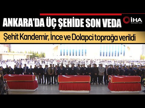 📌 http://bit.ly/IHA-Abone Azerbaycan’dan Türkiye’ye gelmek üzere havalanan Türk Silahlı Kuvvetlerine ait C-130 tipi askeri kargo uçağının Gürcistan’da düşmesi sonucu uçaktaki 20 personel şehit olmuştu. Dün gece Ankara’ya getirilen şehitlerin cenazeleri, Adli Tıp Kurumu’ndaki işlemlerin tamamlanmasının ardından Mürted Hava Meydan Komutanlığı’nda düzenlenen törenle defnedilecekleri şehirlere gönderildi. Şehit Cüneyt Kandemir, Ümit İnce ve Cem Dolapci'nin cenazeleri ise Ankara'da toprağa verildi. Ahmet Hamdi Akseki Camii’nde cuma namazını müteakip kılınan cenaze namazının ardından Hava Pilot Üsteğmen Cüneyt Kandemir'in cenazesi defnedilmek üzere Gölbaşı ilçesindeki Ballıkpınar Mezarlığı'na, Hava Uçak Bakım Astsubay Kıdemli Başçavuş Ümit İnce ve Hava Ulaştırma Uzman Çavuş Cem Dolapci'nın cenazeleri ise Cebeci Şehitliği'ne götürüldü.